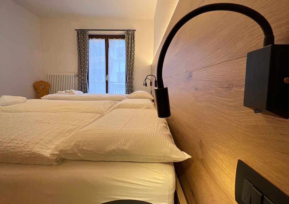 L'appartamento è al primo piano, ha un soggiorno con divano, zona cucina con finestra, due camere, due bagni e balcone con splendida vista sul Catinaccio.